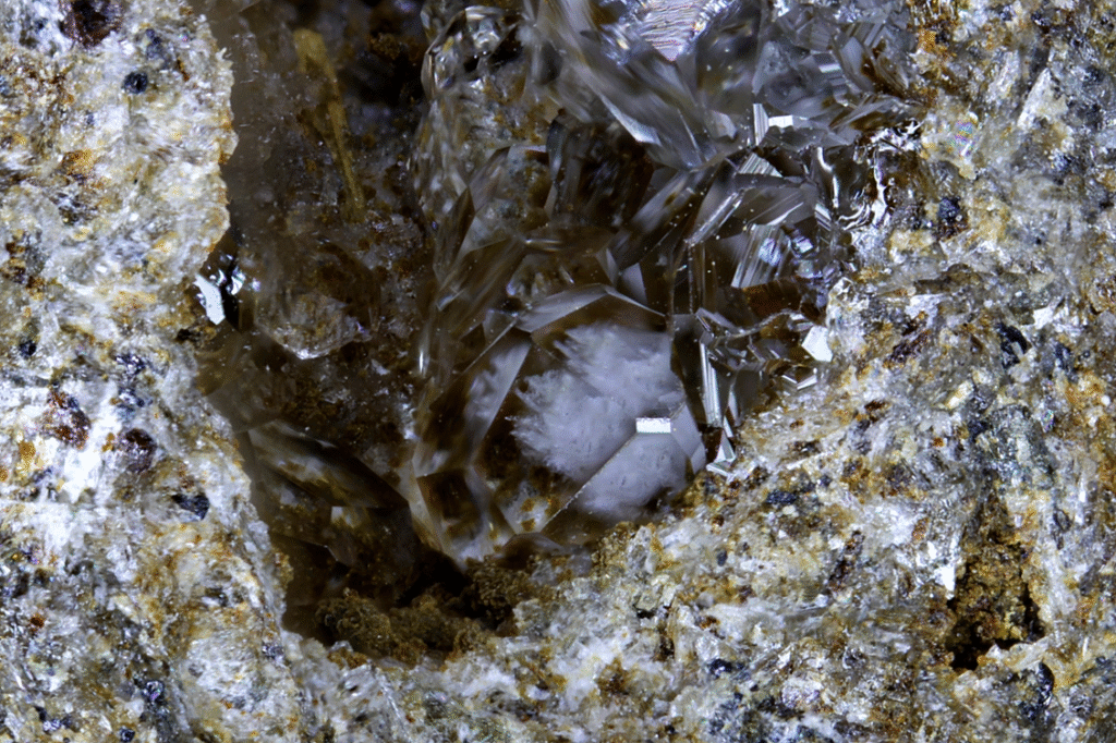 Analcime is found as small water-clear trapezohedra, occasionally with white cores, and often with square c-faces. Larger crystals are usually crackled and clouded. It is associated with most other minerals, but less common in vugs, and analcime is the mineral most likely to be found coating old fractures.