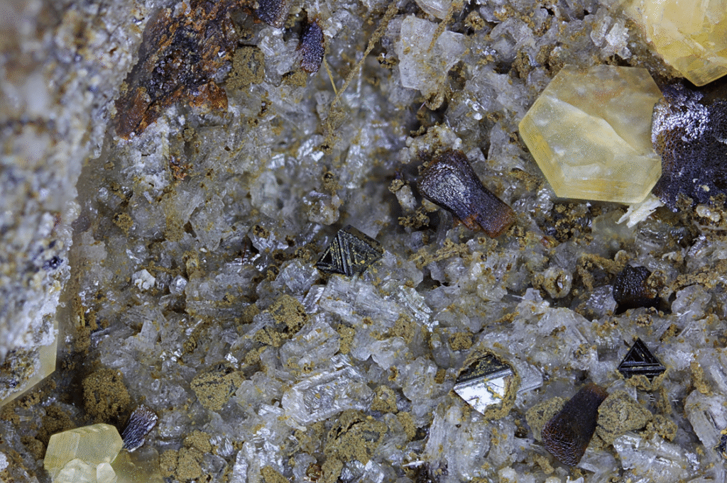 Black magnetite octahedra, some with traces of chlorite on their faces, some of which are stepped. Some magnetite crystals are completely encased in chlorite. Blocky orthoclase crystals form part of the cavity lining. Brown sheaf or club-shaped siderite, yellow hexagonal chabazite-Na, and needles of apatite coated with chlorite.