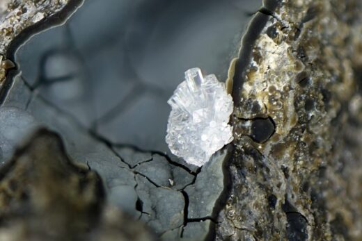Below: Small colourless quartz on white calcite, on brown nontronite(?), Moeraki Point Quarry, Otago, New Zealand. Width of view 11.5mm. Ex Jo Price Collection.