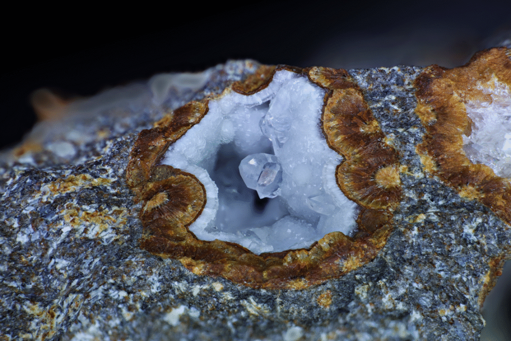 Quartz occurs as small prismatic crystals or drusy coatings on other minerals. There are also seams of agate at Moeraki Point.
