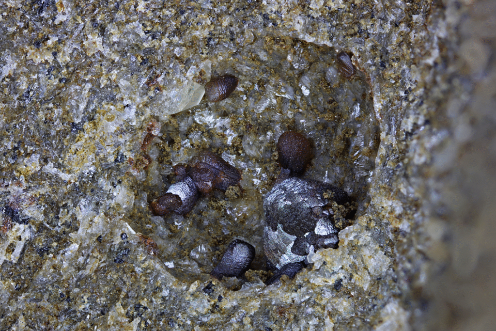 Below: Siderite with orthoclase, Bickers Quarry (Simpkins Quarry), Tokatoka, Kaipara District, Northland Region, North Island, New Zealand. Width of view 6mm.
